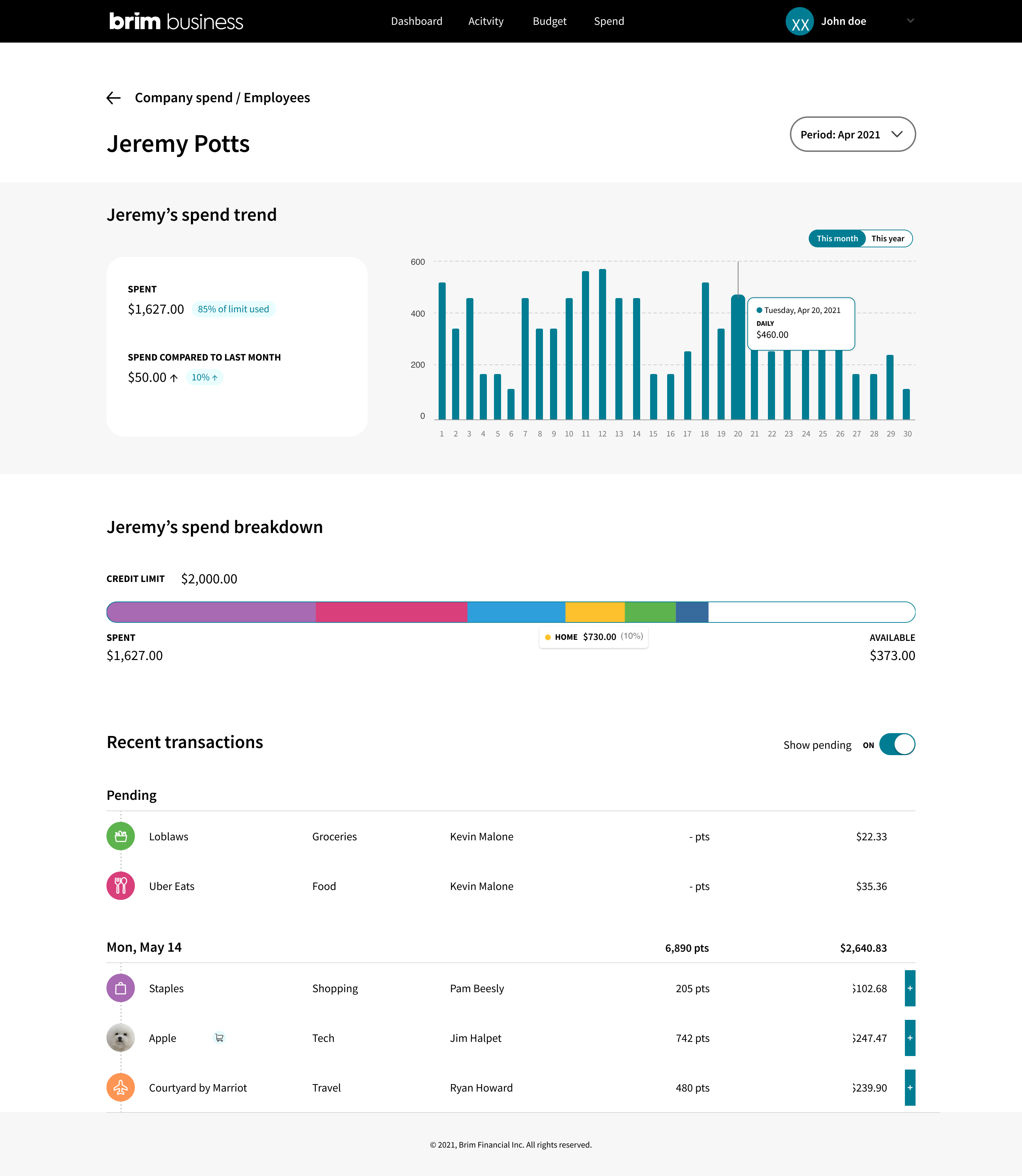 - Research & Analysis: From our research and competitive analysis we found that businesses want a simple overview of current spend by category, employee and departments, want to see a daily and monthly spend, need to create and delete budgets seamlessly, prefer charts and graphs that could be exported for print